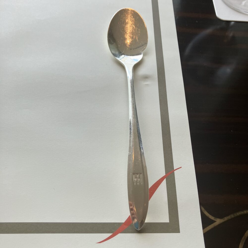 そして、このメニューを味わうために用意された、背に丸みのない特殊な形状のスプーン。そこには、帝国ホテル創業の「1890年」の刻印が刻まれていました!