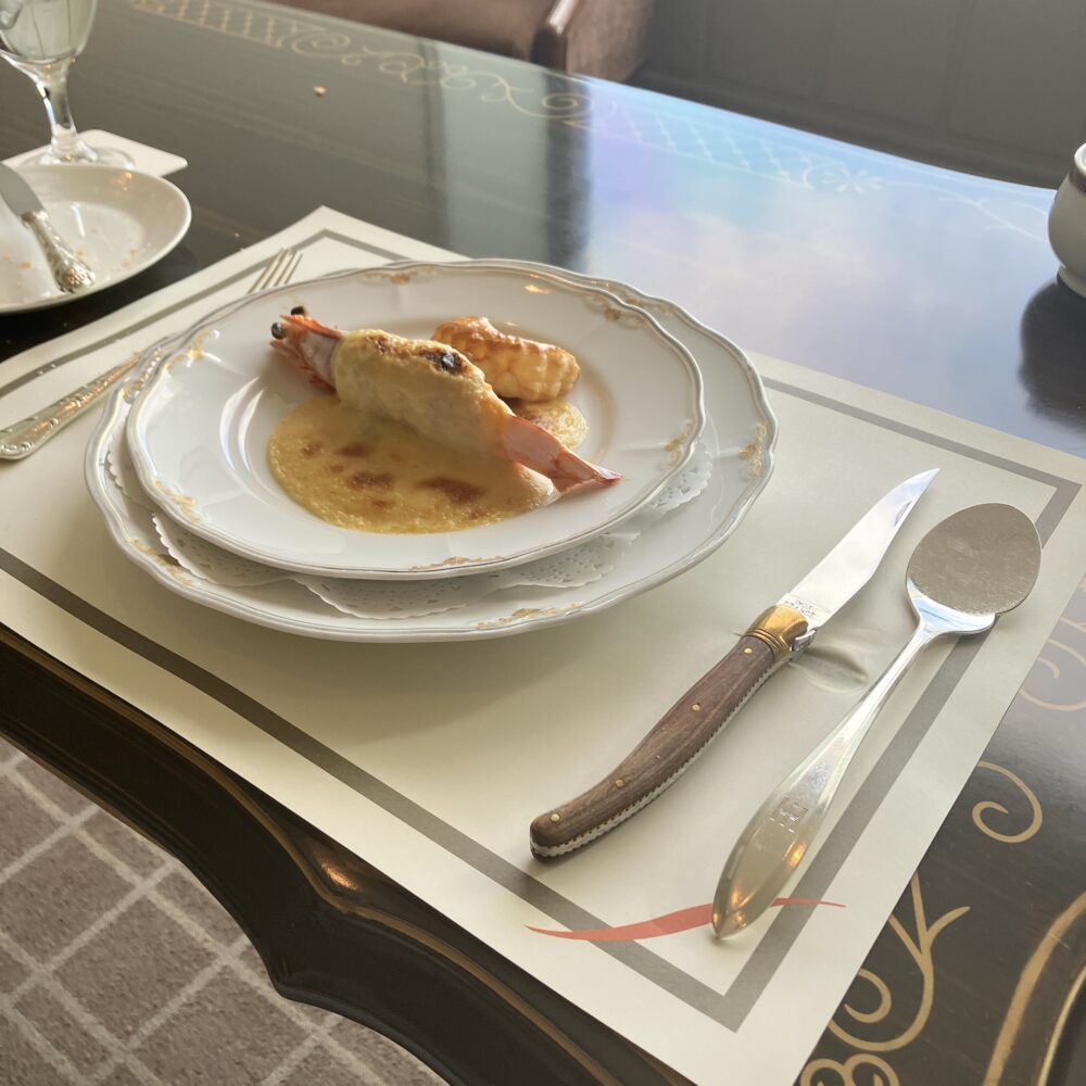 そこから、女王の好物がドーバー海峡の舌平目と海老ということも考慮して、「車海老を舌平目で焼きソースをかけて焼くお料理」を考案したそうです。